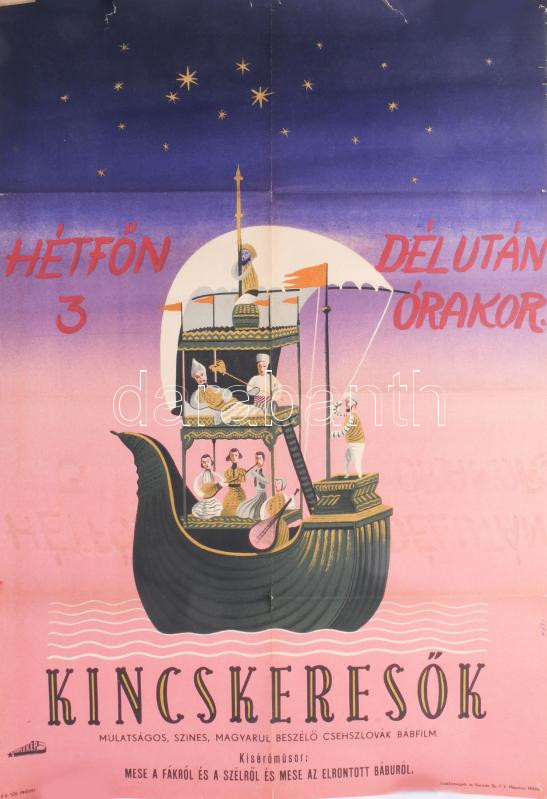 Kincskeresők, csehszlovák, bábfilm plakát, papír, nyomat, rajta kézzel festett felirattal, Héti jelzéssel a plakáton, Játékkártyagyár és Nyomda, hajtásnyomokkal, szakadásokkal, 83x57 cm