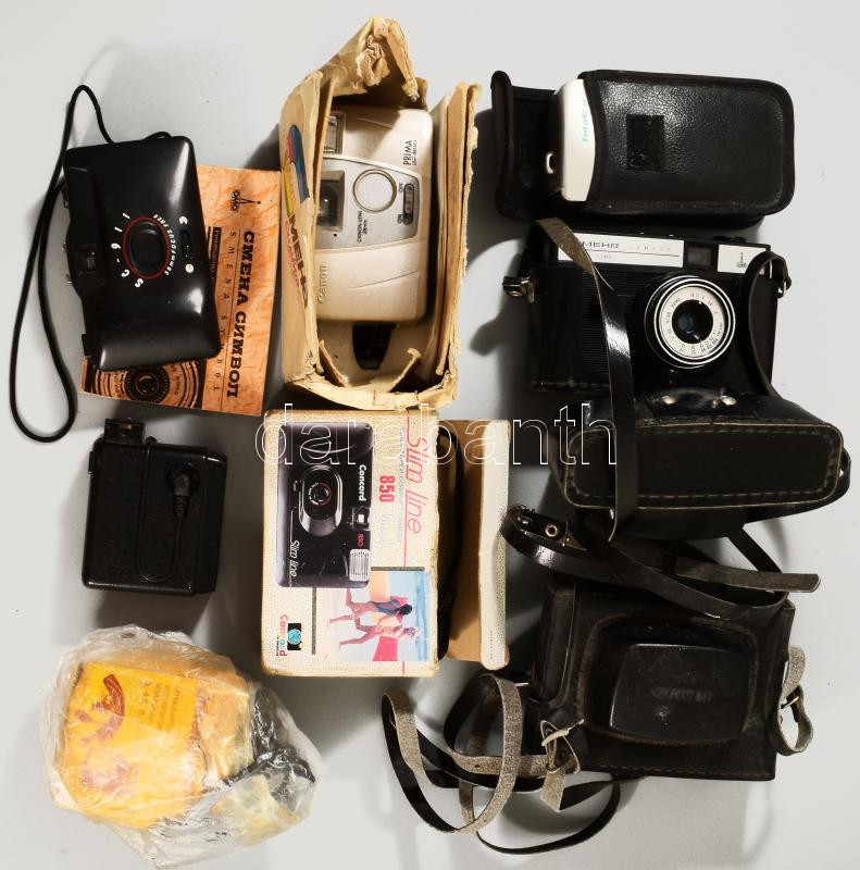 Leírás: Doboznyi vegyes fényképezőgép tétel, közte Canon Prima BF-800, Concord 850, Fotostar AF-621D, Smena Symbol gépekkel.