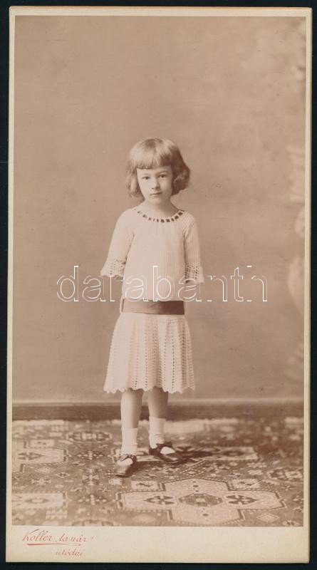 Leírás: 1901 Kislány portréja, kabinetfotó Koller Károly tanár utódai budapesti műterméből, hidegpecséttel jelzett, szép állapotban, 21x11,5 cm