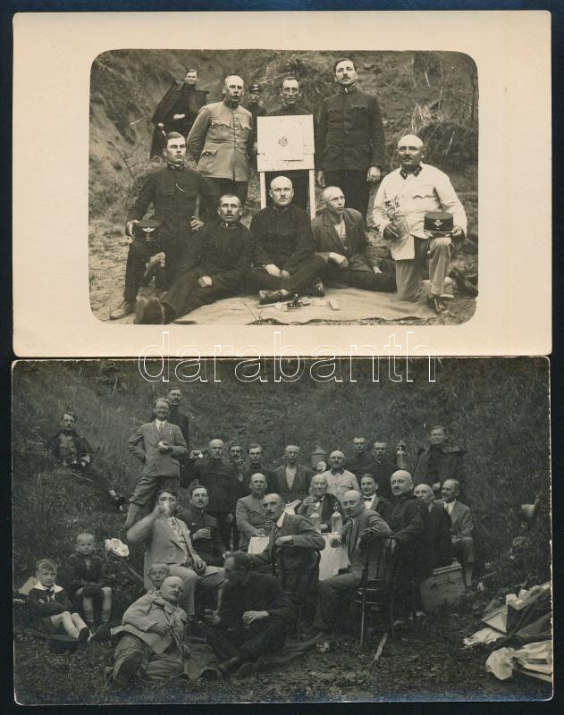 1931 Ózd, szabadban italozó társaság + vasutas tisztek csoportképe céltáblánál (házi céllövő verseny?), 2 db fotólap, az egyik hátoldalon dedikációval, 9x14 cm