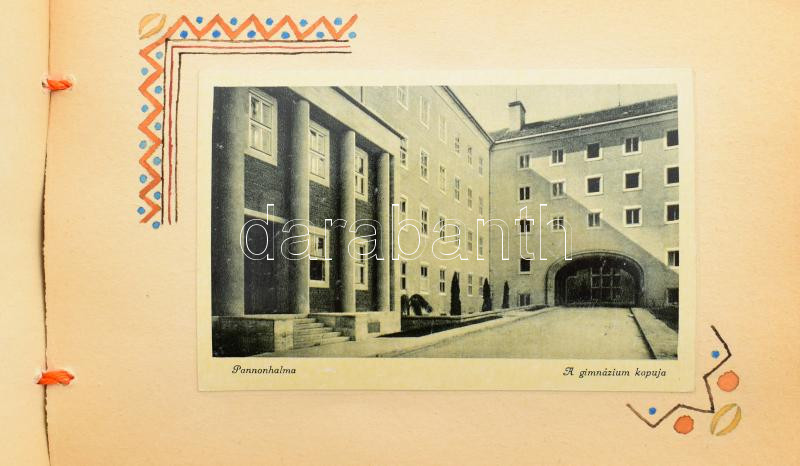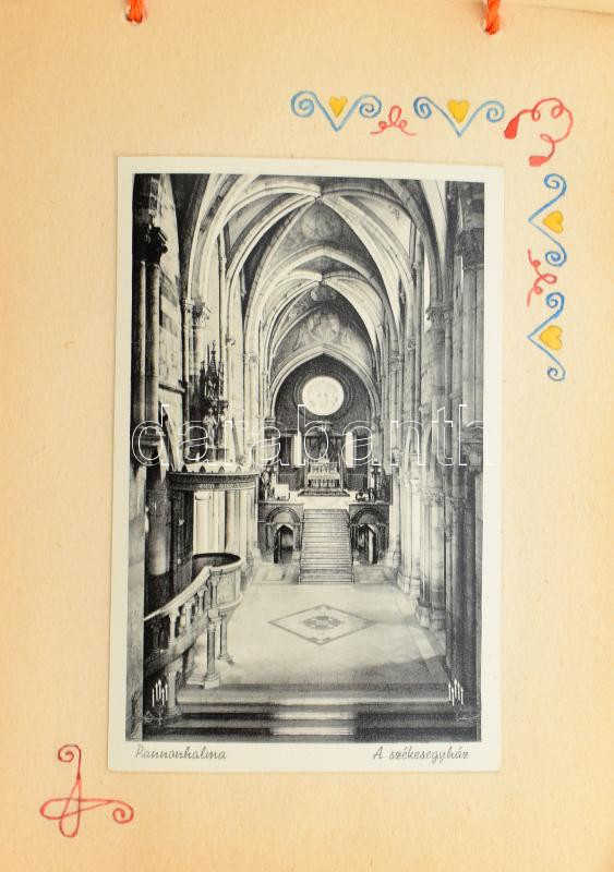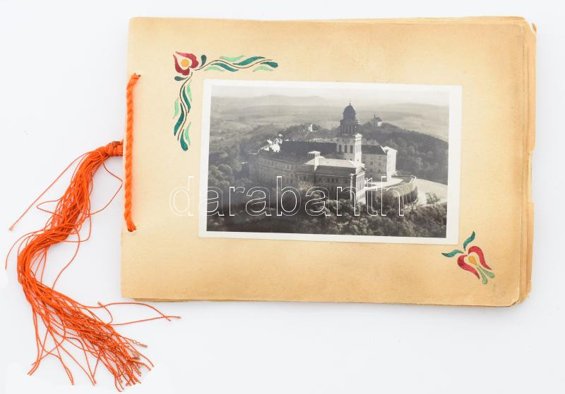 A Pannonhalmi Főapátságról készített egyedi album, 17 db beragasztott fotóval/képeslappal, zsinórfűzéses papírkötésben, helyenként sérülésekkel, egy kijáró lappal, 15x21 cm