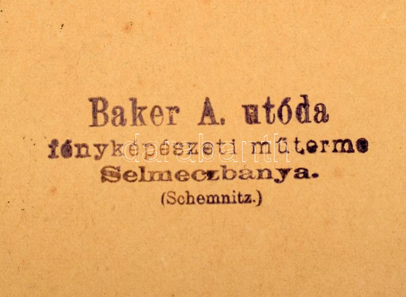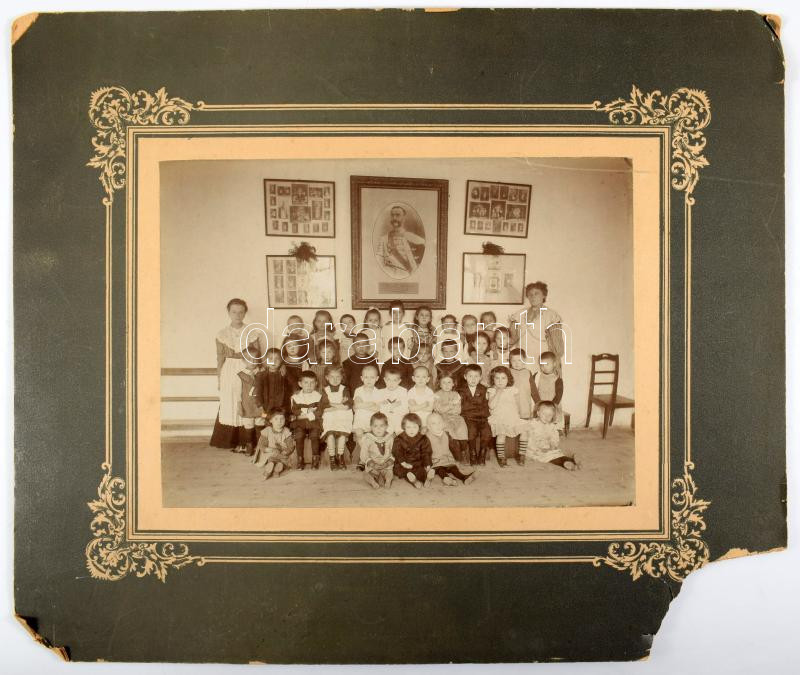 Leírás: ca 1900 Selmecbányai óvoda csoportképe, háttérben az uralkodó képével, nagy méretű kemányhátú fotó kis hiánnyal., 36x30 cm