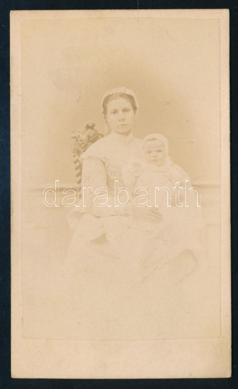 Leírás: cca 1865 Anya gyermekével, vizitkártya Rupprecht Mihály soproni műterméből, díszes verzóval, 10,5x6 cm