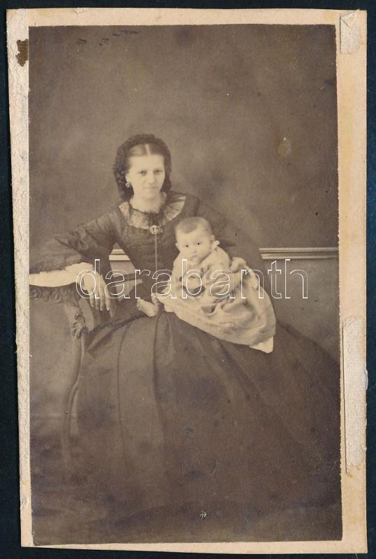 Leírás: cca 1865 Édesanya a babájával. Vizitkártya Dohnányi István nagyszombati műterméből, kopással, vágott, 9,5x6 cm