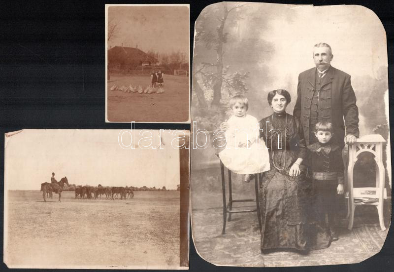 cca 1900-1915 Vegyes fotó tétel, 3 db: Családi portré, kissé sérült, körbevágva, 22,5x17 cm + Alföldi, falusi életképek, az egyik kissé sérült, 16x12 cm és 10x7 cm