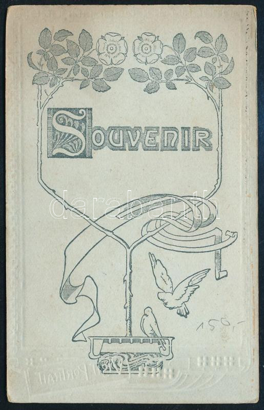 Leírás: cca 1910-1920 Társaság a szabadban, vizitkártya, jelzés nélkül, szecessziós verzóval, 11x7 cm