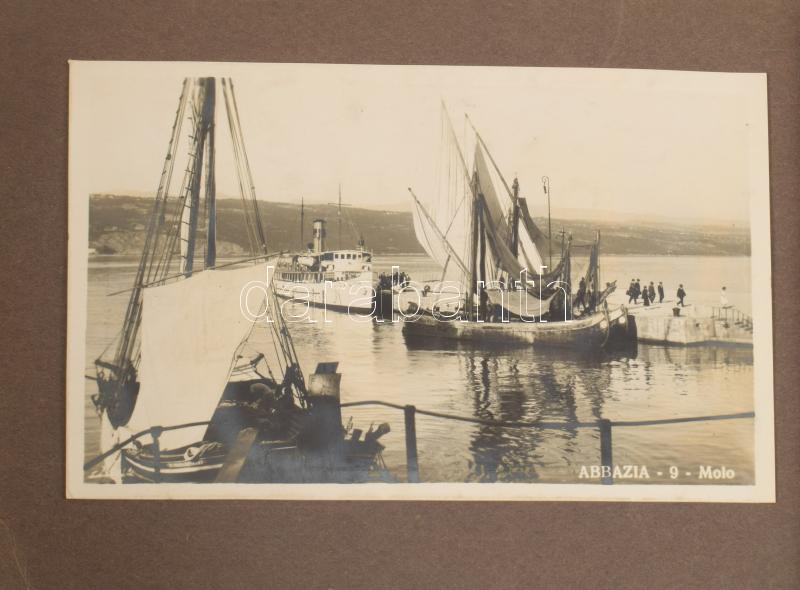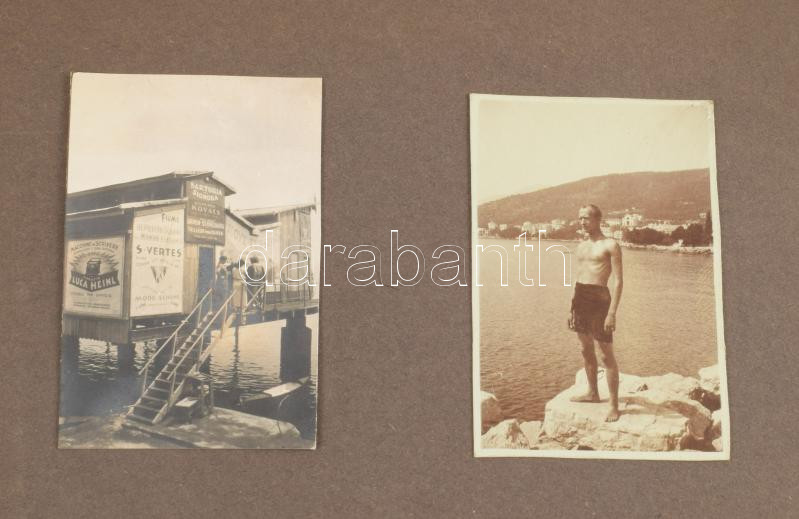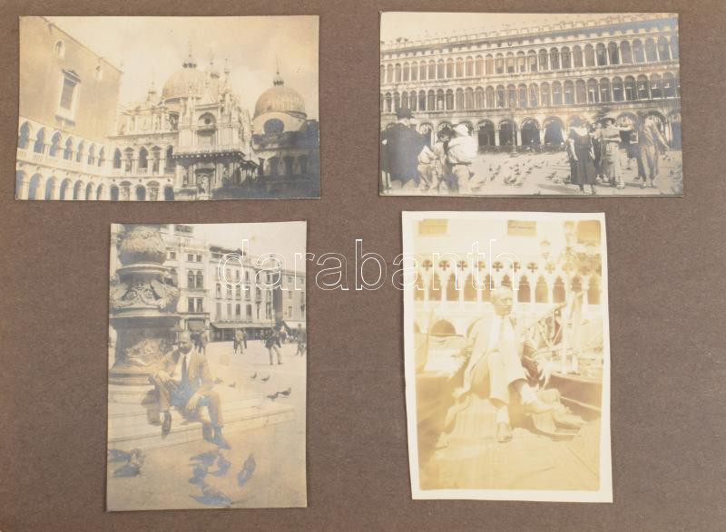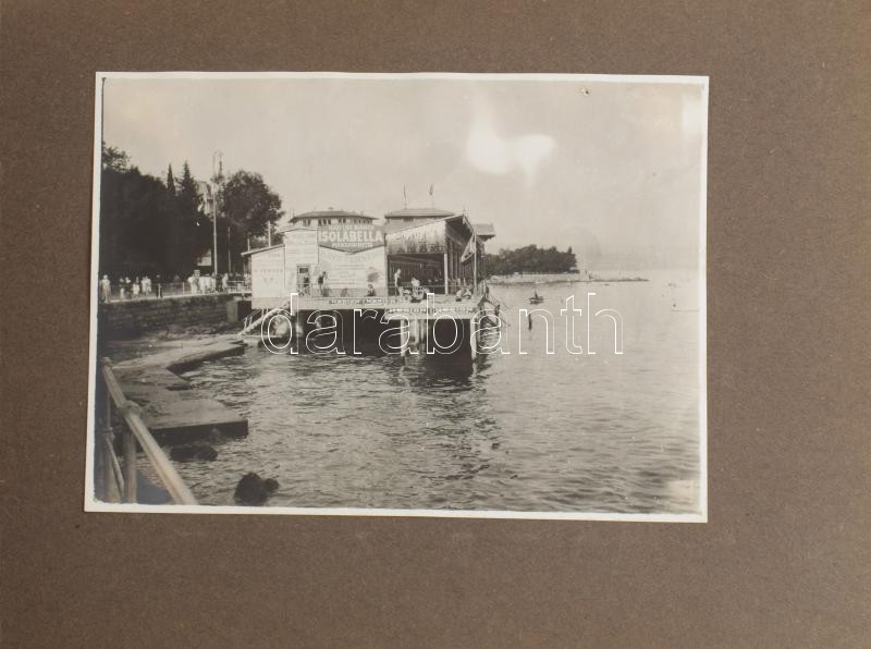 cca 1914 Adriai nyaralás képei, Abbázia, Velence, 42 fotó és fotólap. Haránt-alakú, fűzött papír fotóalbumban, kissé sérült albummal, 6x4 cm x 8x13 cm közötti méretben