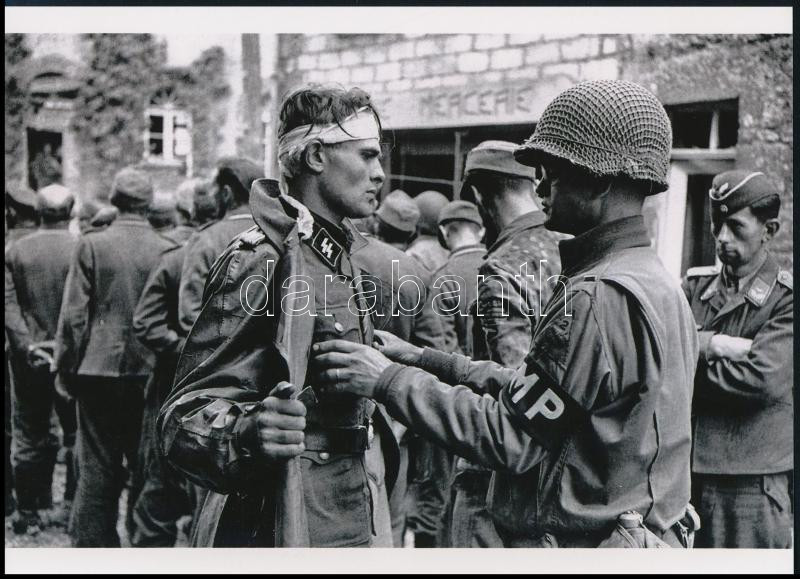 cca 1944 Robert Capa (1913-1954) (eredeti neve Friedmann Endre) magyar - francia fotóriporter felvétele (fogságba esett német katonát motoz egy amerikai katona), 1 db modern nagyítás, jelzés nélkül, Fotó újság archívumából, 15x21 cm