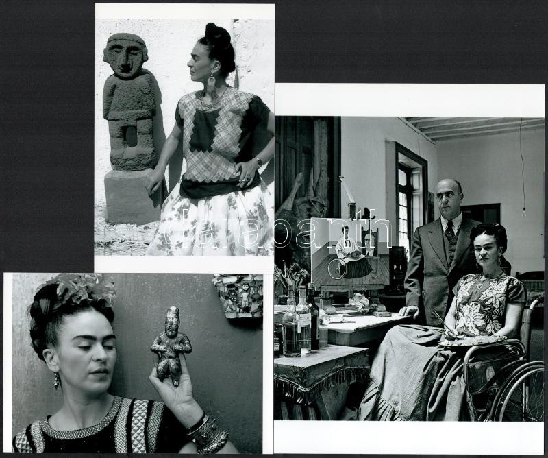 Leírás: cca 1950 Frida Kahlo (1907-1954) mexikói festőművészről készült, jelzés nélküli felvételek, 3 db modern nagyítás, 21x15 cm és 10x15 cm