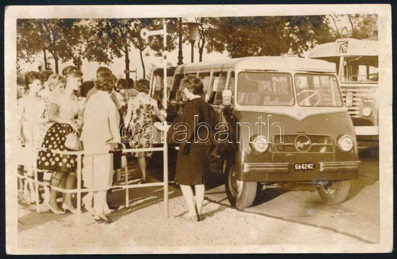 cca 1965 Budapest, a Margitszigetre menő 26-os autóbusz végállomásánál lévő Nysa szigeti sétabuszra való felszállásra várók a megállónál, fotó szép állapotban, 9×13 cm