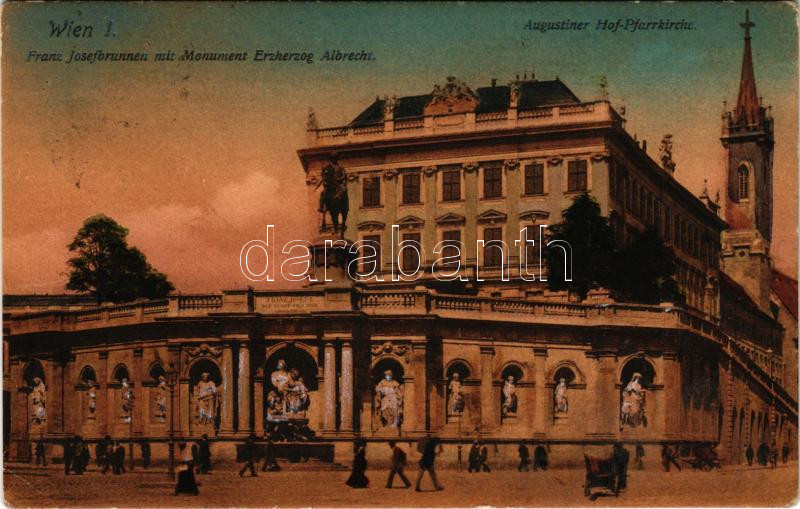 1910 Wien, Vienna, Bécs; Franz Josefbrunnen mit Monument Erzherzog Albrecht, Augustiner Hof-Pfarrkirche. Dr. Trenkler Co. / fountain, monument, church (EB)