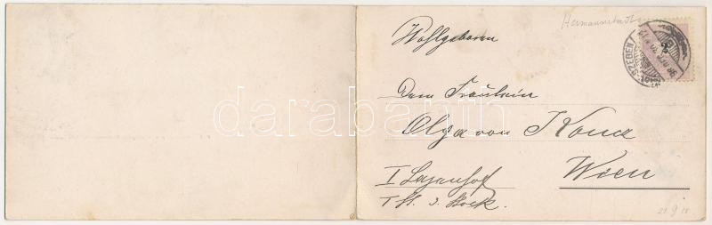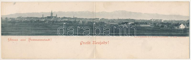 Leírás: 1898 Nagyszeben, Hermannstadt, Sibiu; Prosit Neujahr! / látkép. 2-részes kihajtható panorámalap. G.A. Seraphin, Jos. Drotleff / general view. 2-tiled folding panoramacard (gyűrődések / creases)