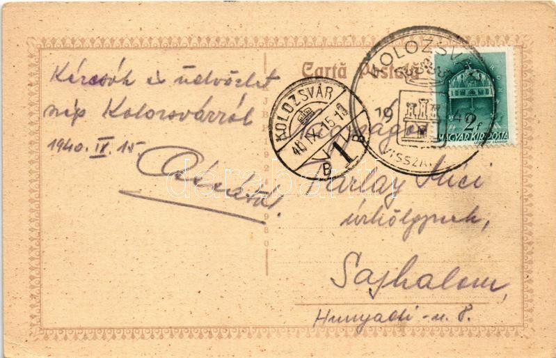 Leírás: 1940 Kolozsvár, Cluj; Tanítók háza / Casa Invatatorilor / teachers' training institute + "1940 Kolozsvár visszatért" So. Stpl (EK)