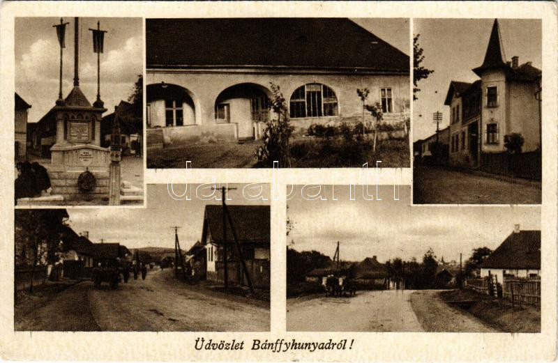 Leírás: Bánffyhunyad, Huedin; mozaiklap 5 képpel: Országzászló, posta, Ravasz László szülőháza / multi-view postcard with 5 images: Hungarian flag, post office (EK)