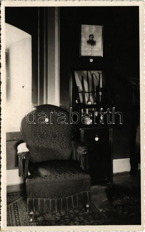 Leírás: Nagyszalonta, Salonta; Arany János múzeum, Arany János fotele, melyben meghalt / Scaunul in care a murit Joan Arany / Arany memorial museum, interior