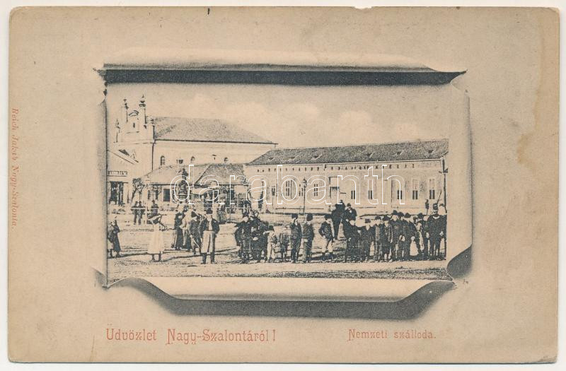 Leírás: Nagyszalonta, Salonta; Nemzeti szálloda, zsinagóga. Reich Jakab kiadása / hotel, synagogue (b)