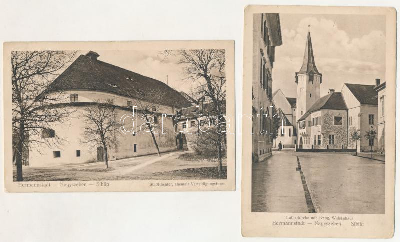Leírás: Nagyszeben, Hermannstadt, Sibiu - 2 db RÉGI város képeslap: színház és evangélikus templom / 2 pre-1945 town postcards: theater and Lutheran church