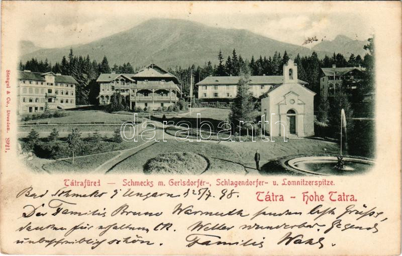 Leírás: 1898 Tátrafüred, Schmecks, Smokovec (Magas-Tátra, Vysoké Tatry); Római katolikus templom, hegycsúcsok / Gerlsdorfer-, Schlagendorfer- u. Lomnitzerspitze / church. Stengel & Co. (fl)