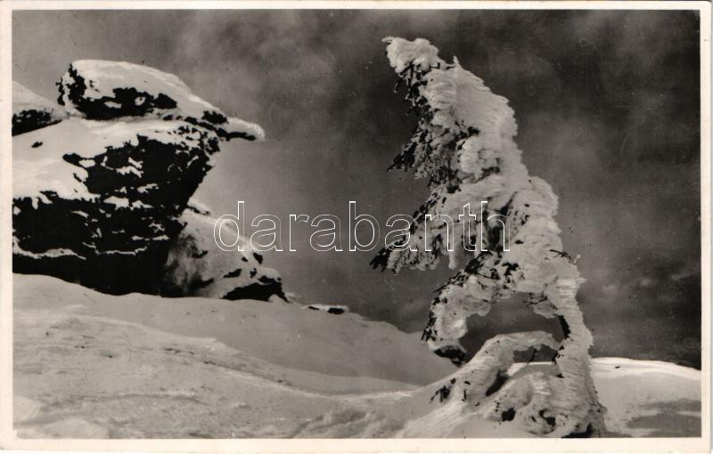 1940 Rozsnyó, Roznava; Barátkő szikla a Ökörhegyen (Pozsálón) a MTE (Magyar Turista Egyesület) rozsnyói osztályának menedékházánál. Hermély Sándor felvétele. Fuchs József kiadása. Hátoldalon Dr. Pázmándi István kir. járásbírósági elnök levele / Skalisko / mountain in winter