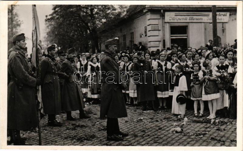 Galánta, a Felvidék felszabadulásának emlékére, bevonulás, katonák, Központi Étterem és Kávéház / entry of the Hungarian troops, soldiers, restaurant, café (fl)