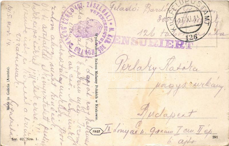 Leírás: 1915 Druzba / Polish folklore. Ser. 62. Nr. 1. s: Juliusz Kossak + "K.u.k. Feldpostamt 126" "M.kir. 305. Honvéd Gyalogezred 407. zászlóalj parancsnoksága" (EB)