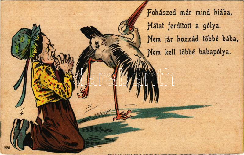 Fohászod már mind hiába, hátat fordított a gólya... / humour art postc... https://www.darabanth.com/hu/510-Gyorsarveres/510.0/Kepeslapok/Humor~564/Fohaszod-mar-mind-hiaba-hatat-forditott-a-golya-humour-art-postcard-with-stork-litho-f~II3441708