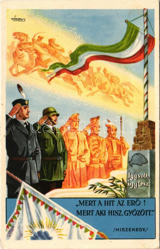 Így volt, így lesz! "Mert a hit az erő! Mert aki hisz, győzött" (Hiszekegy). Kiadja az Ereklyés Országzászló Nagybizottsága / Hungarian irredenta propaganda, Hungarian flag, Trianon s: Lamoss (EK)