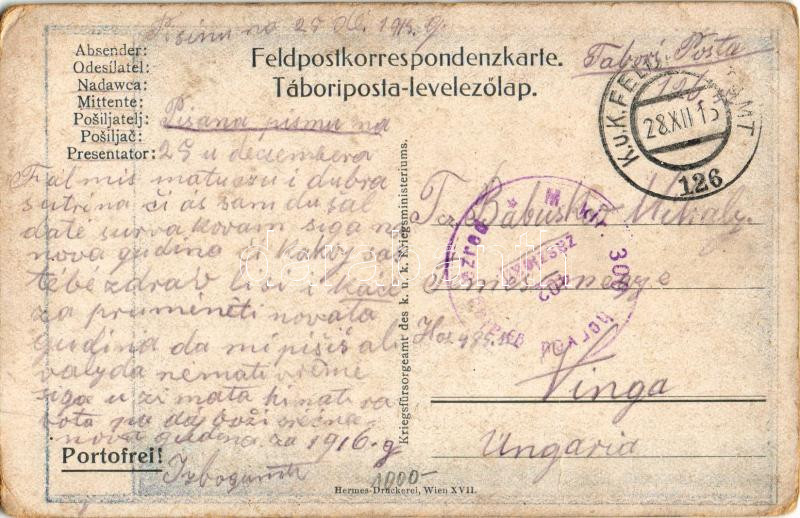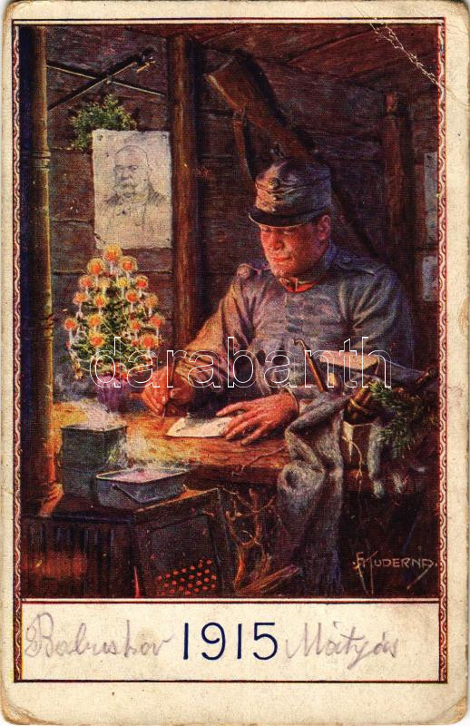 Weihnachten 1915. Hermes-Druckerei / Első világháborús osztrák-magyar katonai karácsonyi üdvözlet, tábori posta / WWI Austro-Hungarian K.u.K. military art postcard with Christmas greeting, Franz Joseph I of Austria portrait, field postcard s: F. Kuderna + "K.u.k. FELDPOSTAMT 126" + "M. KIR. 300. HONVÉD GYALOGEZRED 402. ZÁSZLÓALJ" (EB)