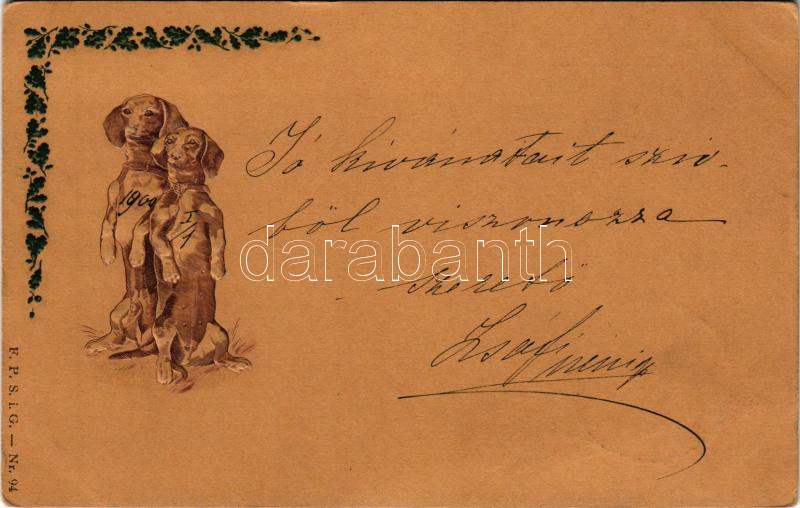 1899 Art Nouveau Embossed Dachshund dogs postcard. F. P. S. i. G. Nr. ... https://www.darabanth.com/hu/510-Gyorsarveres/510.0/Kepeslapok/Kutya~572/1899-Art-Nouveau-Embossed-Dachshund-dogs-postcard-F-P-S-i-G-Nr-94-EK~II3428200