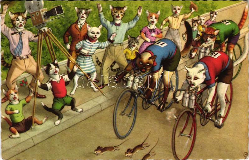 Cats on bicycle chasing mice. Alfred Mainzer. No. 4862. (fa) https://www.darabanth.com/hu/510-Gyorsarveres/510.0/Kepeslapok/Macska~575/Cats-on-bicycle-chasing-mice-Alfred-Mainzer-No-4862-fa~II3406844