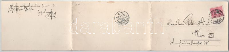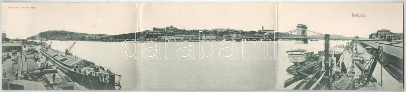 Leírás: 1898 Budapest, látkép, Lánchíd, királyi vár, Várkert Bazár, uszályok, Citadella, rakpart. 3-részes kihajtható panorámalap. Stengel & Co. (Dresden) 4659. (kis szakadások / small tears)