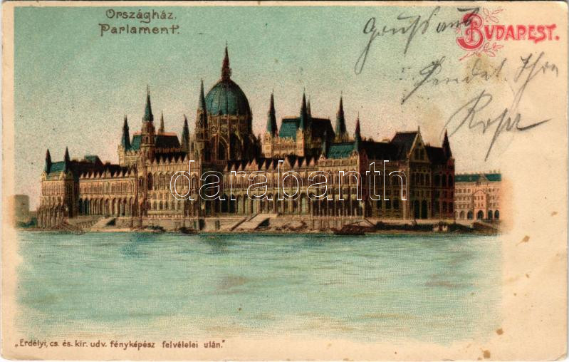 Leírás: 1902 Budapest V. Országház, Parlament. Erdélyi cs. és kir. udvari fényképész felvétele után, litho (fl)