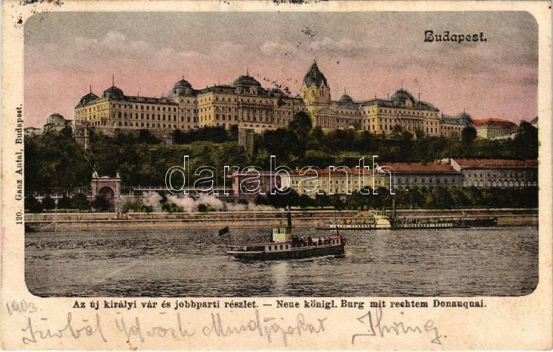 Leírás: 1903 Budapest I. Az új királyi vár és jobbparti részlet, Várkert Bazár, gőzhajó. Ganz Antal 120.