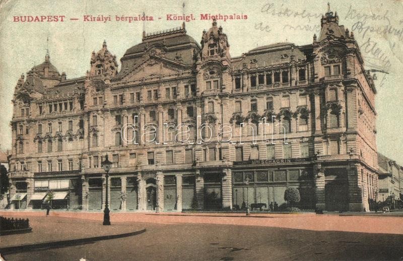 Leírás: 1906 Budapest V. Királyi bérpalota, belvárosi takarékpénztár rt., Mme Schagrin üzlete (EK)