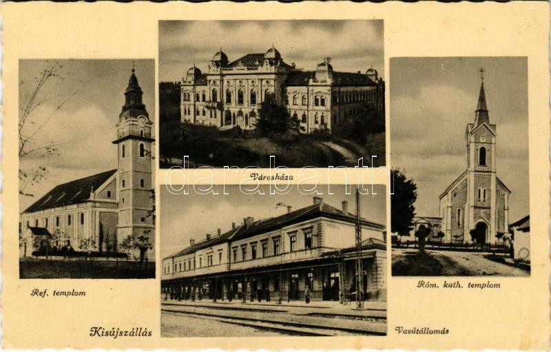 Leírás: 1940 Kisújszállás, Római katolikus templom, Városháza, vasútállomás, református templom. Aigner Lajos kiadása (EK)