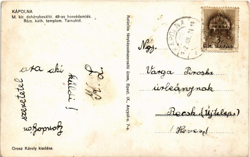 Leírás: 1942 Kápolna, 48-as honvéd emlékszobor, M. kir. dohánybeváltó hivatal, római katolikus templom, Tarna híd. Orosz Károly kiadása (Rb)