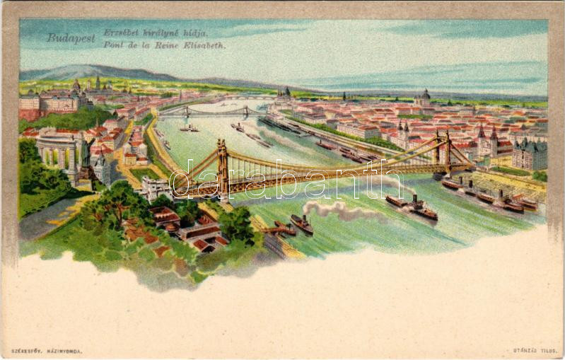 Leírás: Budapest, Erzsébet királyné hídja, Tabán, Szent Gellért szobor, Királyi vár. Székesfőváros Házinyomda litho
