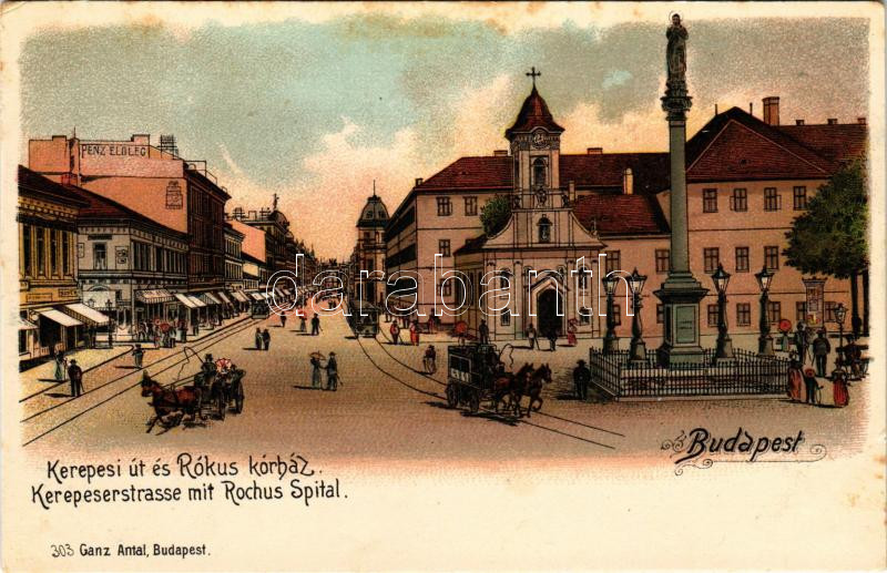 Leírás: Budapest VIII. Kerepesi út (Rákóczi út), Rókus kórház, lóvasút, pénz előleg. Ganz Antal 303. litho (fl)