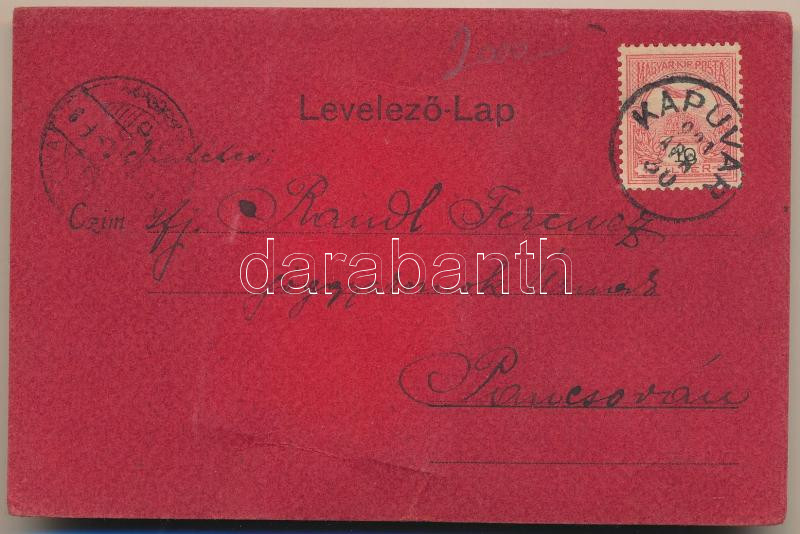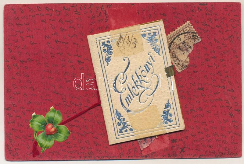 1901 Egyedi, ragasztott művészlap emlékkönyv rátéttel, lóherével, titkosírással írt üzenettel / Unique handmade postcard with memorial book and clover (felületi sérülés / surface damage)