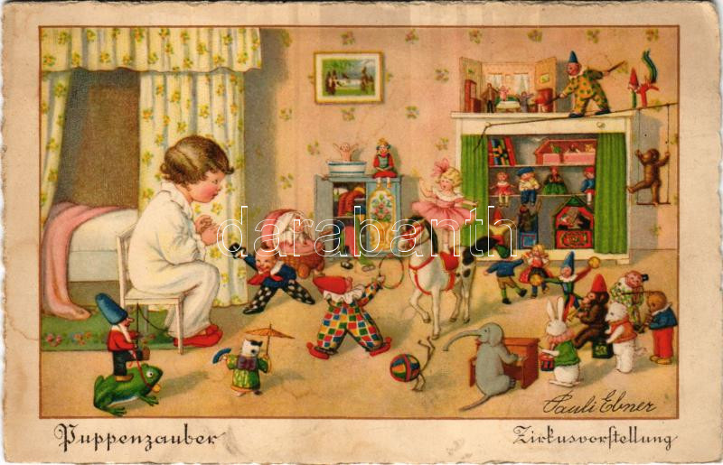 Puppenzauber, Zirkusvorstellung. B. Dondorf / Baba varázsló, cirkuszi előadás, gyerek művészlap / Children art postcard, circus performance. litho s: Pauli Ebner (fl)