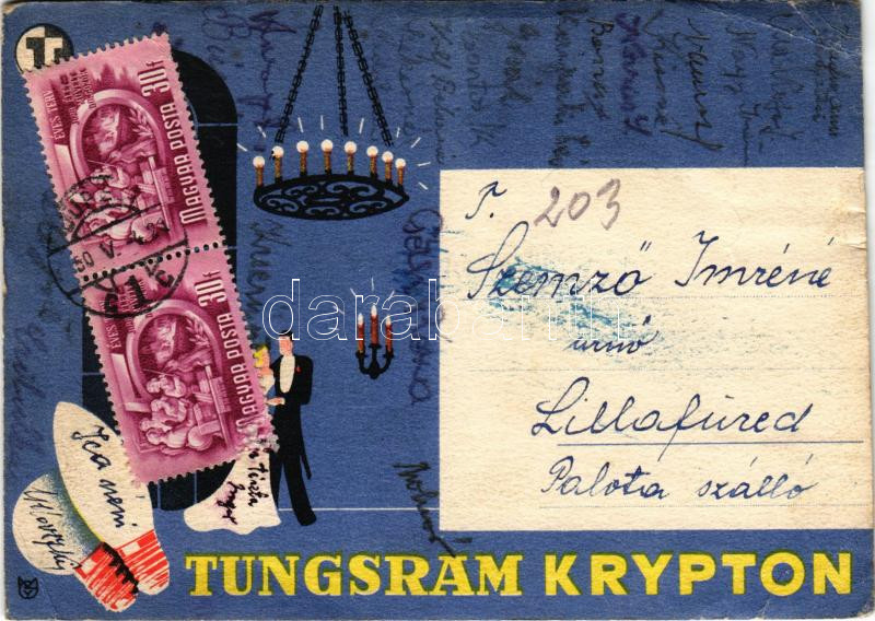 Leírás: 1950 Tungsram Krypton izzó reklámlapja, hátoldalán kézi rajz / Hungarian light bulb advertisement postcard s: Macskássy (non PC) (gyűrődések / creases)