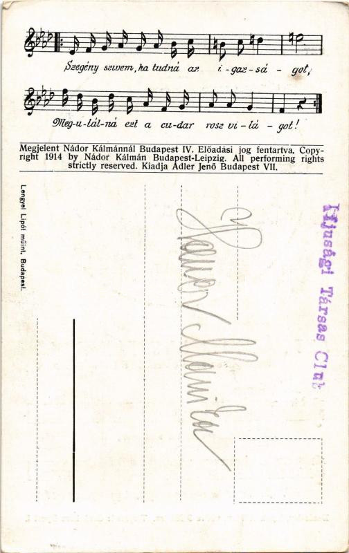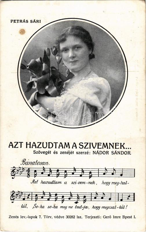 Leírás: Petráss Sári. Zenés lev.-lapok 7. "Azt hazudtam a szívemnek..." Nádor Kálmán, Lengyel Lipót műintézete + "Ifjúsági Társas Club" (EK)