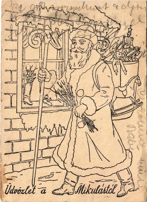 1942 Üdvözlet a Mikulástól! / Saint Nicholas greeting art postcard (EK... https://www.darabanth.com/hu/510-Gyorsarveres/510.0/Kepeslapok/Udvozlolapok-Unnepek~586/1942-Udvozlet-a-Mikulastol-Saint-Nicholas-greeting-art-postcard-EK~II3451834