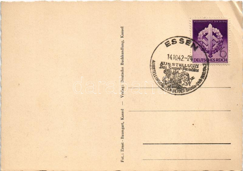 Leírás: 1942 Kassel, Grossdeutscher Reichskriegertag, Adolf Hitler + "ESSEN AUSSTELLUNGSHALLEN BEI DER GRUGA" So. Stpl. (EB)