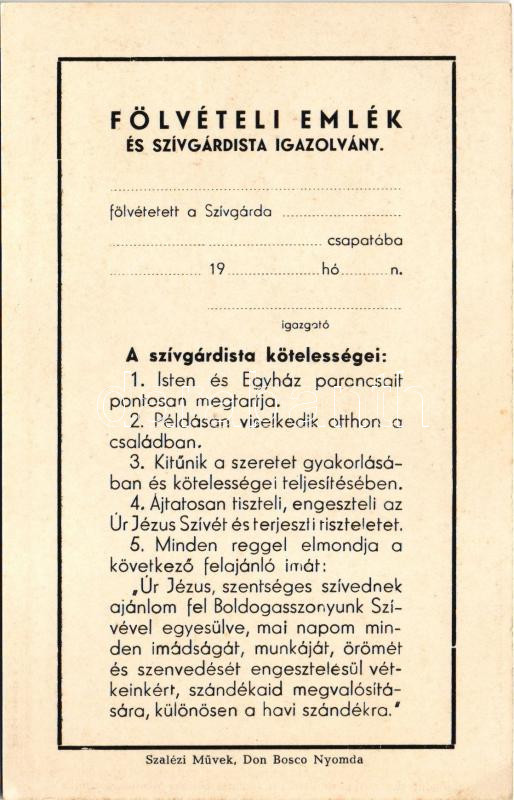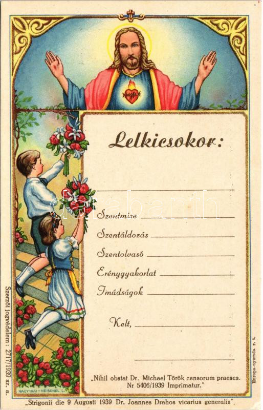 Lelkicsokor. "Nihil obstat dr. Michael Török censorum praeses Nr. 5406/1939. Imprimatur. Hátoldalán szívgárdista igazolvány / Hungarian religious card (non PC) (EK)