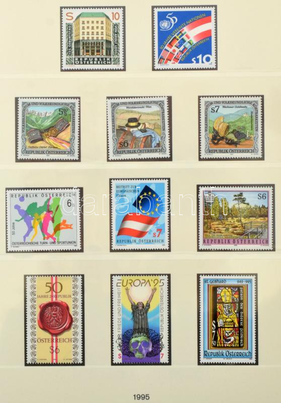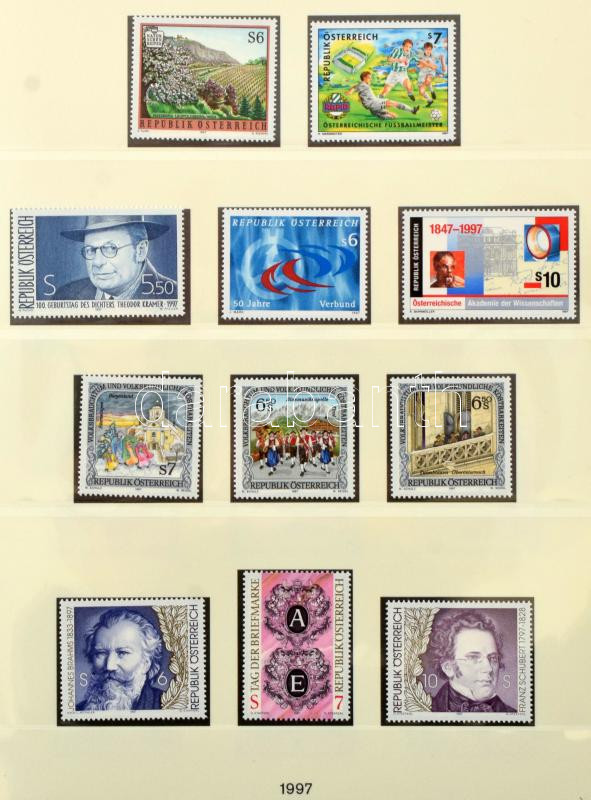 Leírás: Ausztria 1991-1998 Postatiszta gyűjtemény + 1996-1998 pecsételt gyűjtemény, előnyomott falcmentes albumban