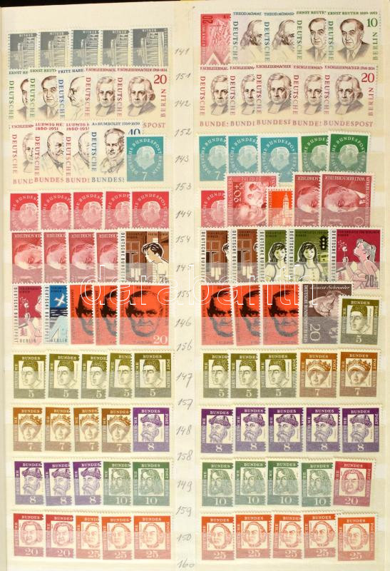 Leírás: Berlin összeállítás nagyon sok teljes sorral, többletpéldányokkal, összesen több mint 1.800 db bélyeg + kevés NSZK, 10 A/4-es berakólapon