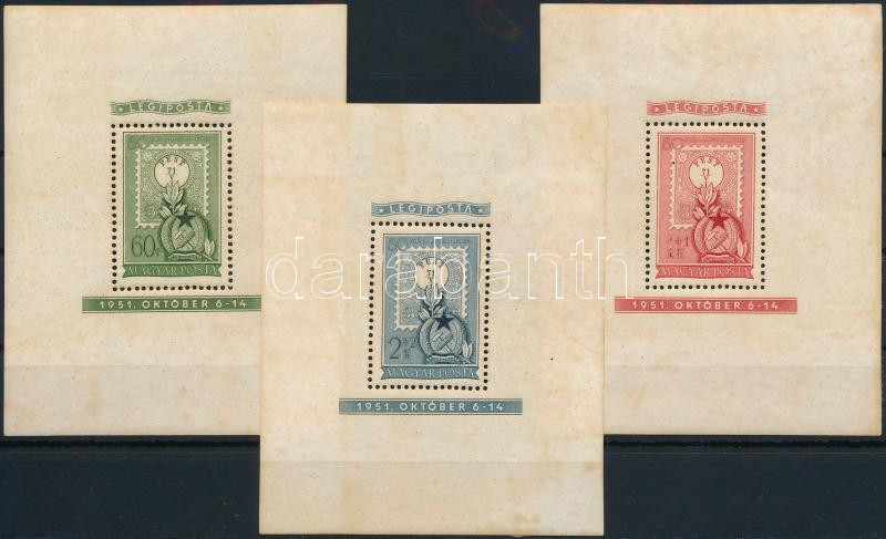 Leírás: 1951 80 éves a magyar bélyeg blokksor (51.000) (rozsda) / Mi 20-22 blocks (stain)