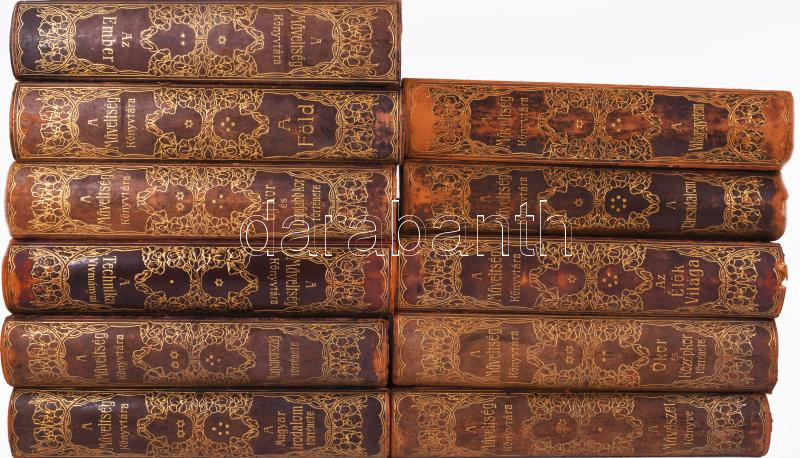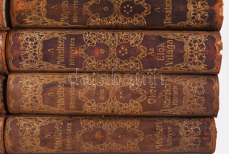 A Műveltség Könyvtára sorozat összesen 11 kötete: Az újkor és legújabb kor története.; Az ó- és középkor története.; A művészet könyve.; A társadalom.; Az élők világa.; A Föld.; Az ember.; A technika vivmányai az utolsó száz évben.; A magyar irodalom története 1900-ig.; Magyarország története. Bp., 1905-1913, Athenaeum. Kiadói aranyozott, fém plakettel díszített (egy kivételével mindegyik megvan), szecessziós félbőr sorozatkötés, változó állapotban, sérülésekkel, laphiányok előfordulhatnak.