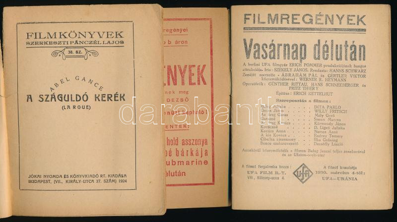 Leírás: Abel Gance: A száguldó kerék. Filmkönyvek 38. sz. Bp., 1924, Jókai, 48 p. Kiadói papírkötés, kissé foltos, sérült borítóval. + Székely János: Vasárnap délután. Filmregények. Bp., 1930, Váczi Dezső (Singer-ny.), 32 p. Kiadói tűzött papírkötés.